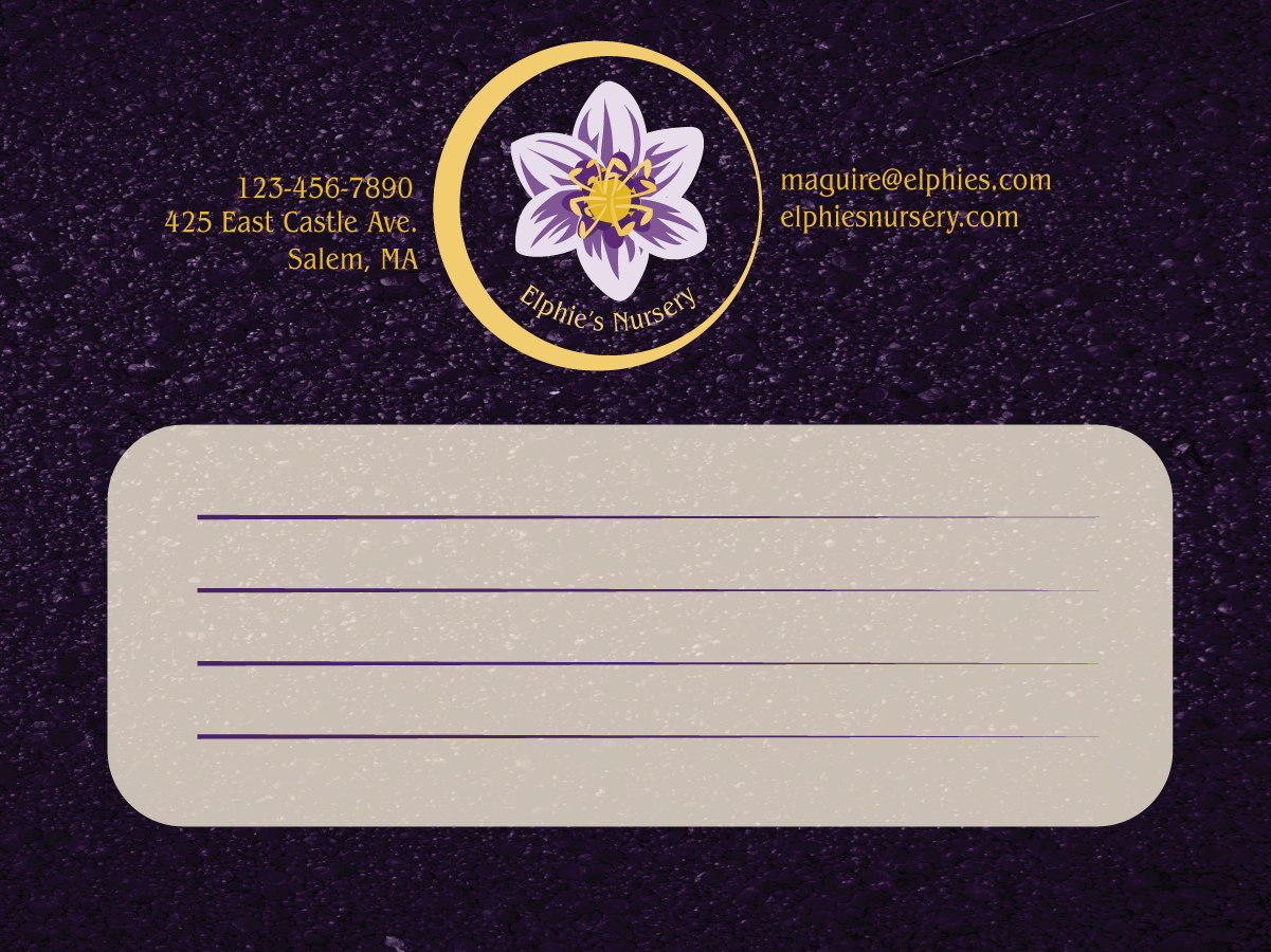 I went with purples, yellows and greens for Elphie’s branding with this beady almost zoomed in dirt texture. The purples compliment the florals in the logo, the yellows break it up, and the green is for the love of plants.